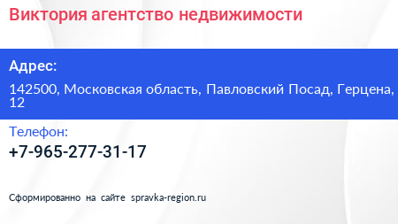 Виктория, агентство недвижимости по адресу 142500, Московская область, Павловский Посад, Герцена, 12 в дальнейшем Организация, размещена в следующих категориях:
