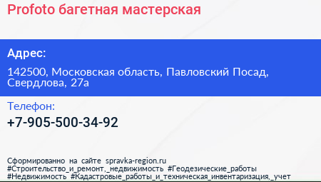 Profoto, багетная мастерская по адресу 142500, Московская область, Павловский Посад, Свердлова, 27а в дальнейшем Организация, размещена в следующих категориях: