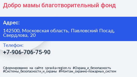Добро-мамы, благотворительный фонд по адресу 142500, Московская область, Павловский Посад, Свердлова, 20 в дальнейшем Организация, размещена в следующих категориях: