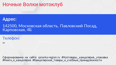 Ночные Волки, мотоклуб по адресу 142500, Московская область, Павловский Посад, Карповская, 4Б в дальнейшем Организация, размещена в следующих категориях: