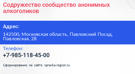 Содружество, сообщество анонимных алкоголиков по адресу 142500, Московская область, Павловский Посад, Павловская, 28 в дальнейшем Организация, размещена в следующих категориях: