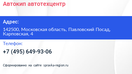 Автокип, автотехцентр по адресу 142500, Московская область, Павловский Посад, Карповская, 4 в дальнейшем Организация, размещена в следующих категориях: