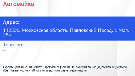 Автомойка по адресу 142506, Московская область, Павловский Посад, 1 Мая, 28а в дальнейшем Организация, размещена в следующих категориях: