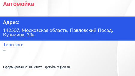 Автомойка по адресу 142507, Московская область, Павловский Посад, Кузьмина, 33а в дальнейшем Организация, размещена в следующих категориях:
