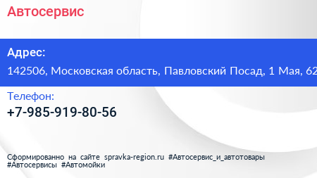 Автосервис по адресу 142506, Московская область, Павловский Посад, 1 Мая, 62 в дальнейшем Организация, размещена в следующих категориях: