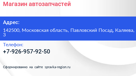 Магазин автозапчастей по адресу 142500, Московская область, Павловский Посад, Каляева, 3 в дальнейшем Организация, размещена в следующих категориях: