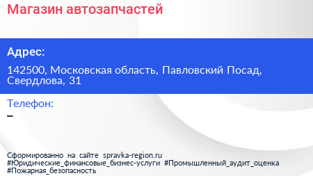 Магазин автозапчастей по адресу 142500, Московская область, Павловский Посад, Свердлова, 31 в дальнейшем Организация, размещена в следующих категориях: