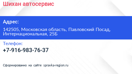 Шихан, автосервис по адресу 142505, Московская область, Павловский Посад, Интернациональная, 25Б в дальнейшем Организация, размещена в следующих категориях: