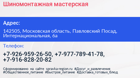 Шиномонтажная мастерская по адресу 142505, Московская область, Павловский Посад, Интернациональная, 6а в дальнейшем Организация, размещена в следующих категориях: