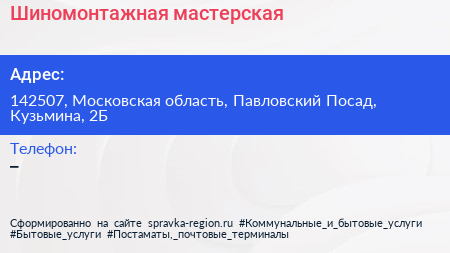 Шиномонтажная мастерская по адресу 142507, Московская область, Павловский Посад, Кузьмина, 2Б в дальнейшем Организация, размещена в следующих категориях: