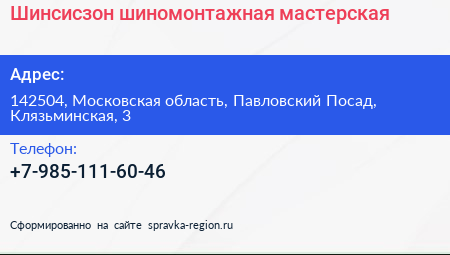 Шинсисзон, шиномонтажная мастерская по адресу 142504, Московская область, Павловский Посад, Клязьминская, 3 в дальнейшем Организация, размещена в следующих категориях: