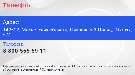 Татнефть по адресу 142502, Московская область, Павловский Посад, Южная, 47а в дальнейшем Организация, размещена в следующих категориях: