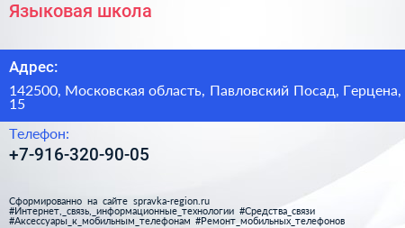 Языковая школа по адресу 142500, Московская область, Павловский Посад, Герцена, 15 в дальнейшем Организация, размещена в следующих категориях: