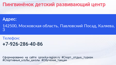 Пингвинёнок, детский развивающий центр по адресу 142500, Московская область, Павловский Посад, Каляева, 3 в дальнейшем Организация, размещена в следующих категориях: