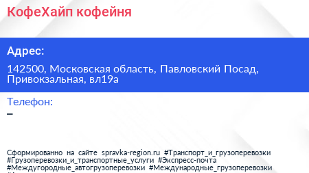 КофеХайп, кофейня по адресу 142500, Московская область, Павловский Посад, Привокзальная, вл19а в дальнейшем Организация, размещена в следующих категориях: