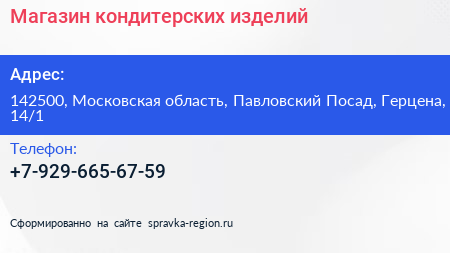 Магазин кондитерских изделий по адресу 142500, Московская область, Павловский Посад, Герцена, 14/1 в дальнейшем Организация, размещена в следующих категориях: