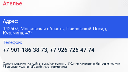 Ателье по адресу 142507, Московская область, Павловский Посад, Кузьмина, 47г в дальнейшем Организация, размещена в следующих категориях: