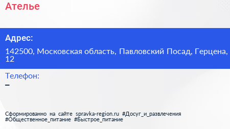 Ателье по адресу 142500, Московская область, Павловский Посад, Герцена, 12 в дальнейшем Организация, размещена в следующих категориях: