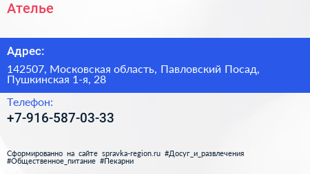 Ателье по адресу 142507, Московская область, Павловский Посад, Пушкинская 1-я, 28 в дальнейшем Организация, размещена в следующих категориях: