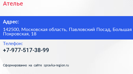 Ателье по адресу 142500, Московская область, Павловский Посад, Большая Покровская, 18 в дальнейшем Организация, размещена в следующих категориях: