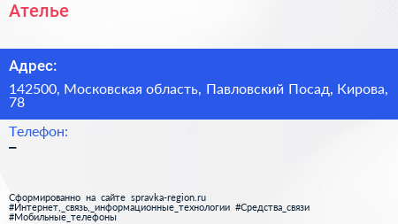 Ателье по адресу 142500, Московская область, Павловский Посад, Кирова, 78 в дальнейшем Организация, размещена в следующих категориях: