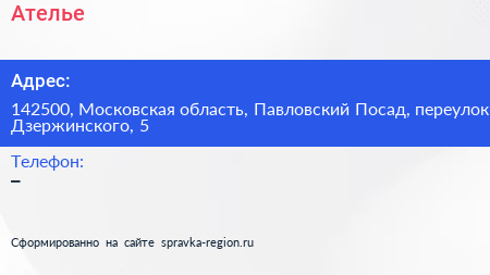 Ателье по адресу 142500, Московская область, Павловский Посад, переулок Дзержинского, 5 в дальнейшем Организация, размещена в следующих категориях: