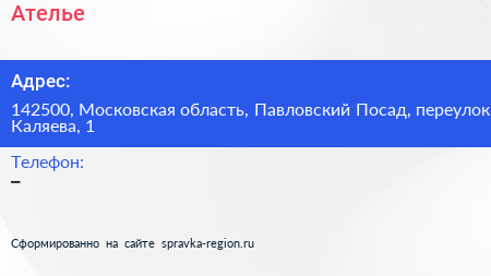 Ателье по адресу 142500, Московская область, Павловский Посад, переулок Каляева, 1 в дальнейшем Организация, размещена в следующих категориях: