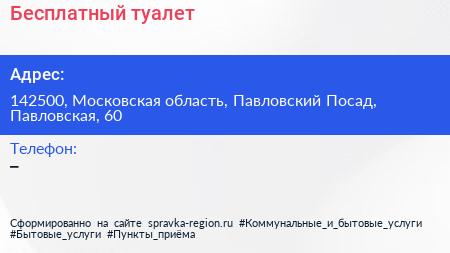 Бесплатный туалет по адресу 142500, Московская область, Павловский Посад, Павловская, 60 в дальнейшем Организация, размещена в следующих категориях: