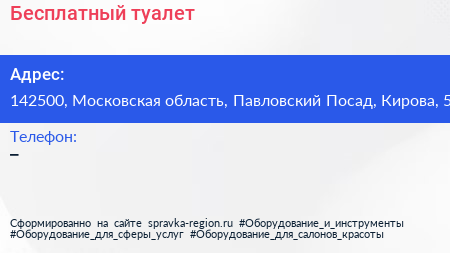 Бесплатный туалет по адресу 142500, Московская область, Павловский Посад, Кирова, 5 в дальнейшем Организация, размещена в следующих категориях: