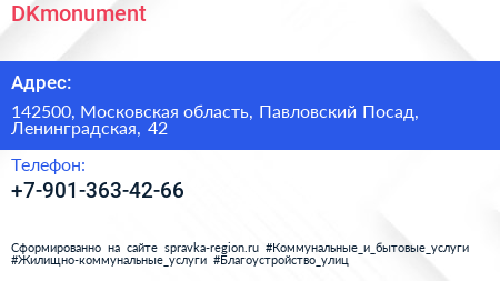 DKmonument по адресу 142500, Московская область, Павловский Посад, Ленинградская, 42 в дальнейшем Организация, размещена в следующих категориях: