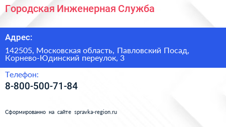 Городская Инженерная Служба по адресу 142505, Московская область, Павловский Посад, Корнево-Юдинский переулок, 3 в дальнейшем Организация, размещена в следующих категориях: