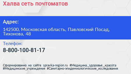 Халва, сеть почтоматов по адресу 142500, Московская область, Павловский Посад, Тихонова, 48 в дальнейшем Организация, размещена в следующих категориях: