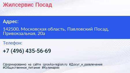 Жилсервис-Посад по адресу 142500, Московская область, Павловский Посад, Привокзальная, 20а в дальнейшем Организация, размещена в следующих категориях: