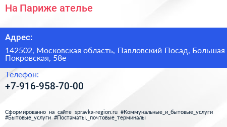 На Париже, ателье по адресу 142502, Московская область, Павловский Посад, Большая Покровская, 58е в дальнейшем Организация, размещена в следующих категориях: