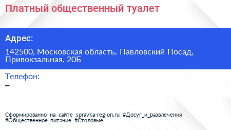 Платный общественный туалет по адресу 142500, Московская область, Павловский Посад, Привокзальная, 20Б в дальнейшем Организация, размещена в следующих категориях: