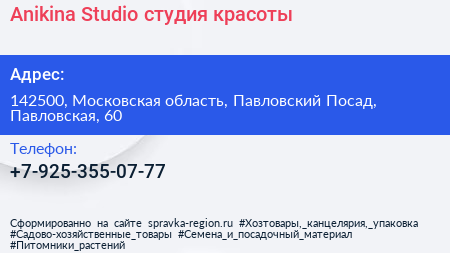 Anikina Studio, студия красоты по адресу 142500, Московская область, Павловский Посад, Павловская, 60 в дальнейшем Организация, размещена в следующих категориях: