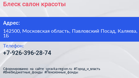 Блеск, салон красоты по адресу 142500, Московская область, Павловский Посад, Каляева, 1Б в дальнейшем Организация, размещена в следующих категориях: