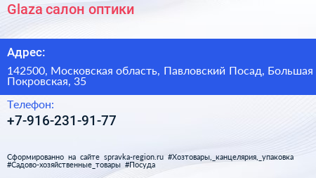 Glaza, салон оптики по адресу 142500, Московская область, Павловский Посад, Большая Покровская, 35 в дальнейшем Организация, размещена в следующих категориях: