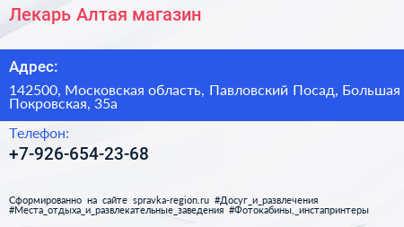 Лекарь Алтая, магазин по адресу 142500, Московская область, Павловский Посад, Большая Покровская, 35а в дальнейшем Организация, размещена в следующих категориях: