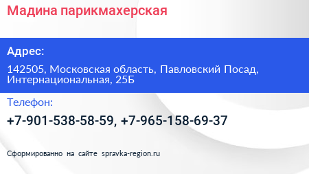 Мадина, парикмахерская по адресу 142505, Московская область, Павловский Посад, Интернациональная, 25Б в дальнейшем Организация, размещена в следующих категориях: