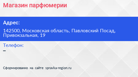 Магазин парфюмерии по адресу 142500, Московская область, Павловский Посад, Привокзальная, 19 в дальнейшем Организация, размещена в следующих категориях: