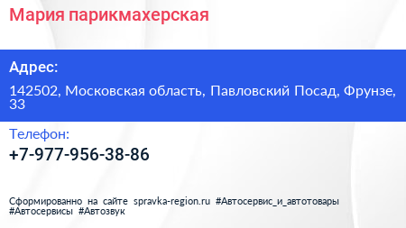 Мария, парикмахерская по адресу 142502, Московская область, Павловский Посад, Фрунзе, 33 в дальнейшем Организация, размещена в следующих категориях: