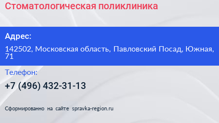 Стоматологическая поликлиника по адресу 142502, Московская область, Павловский Посад, Южная, 71 в дальнейшем Организация, размещена в следующих категориях: