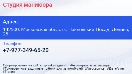 Студия маникюра по адресу 142500, Московская область, Павловский Посад, Ленина, 25 в дальнейшем Организация, размещена в следующих категориях: