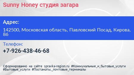 Sunny Honey, студия загара по адресу 142500, Московская область, Павловский Посад, Кирова, 86 в дальнейшем Организация, размещена в следующих категориях: