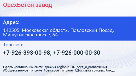 ОрехБетон, завод по адресу 142505, Московская область, Павловский Посад, Мишутинское шоссе, 64 в дальнейшем Организация, размещена в следующих категориях: