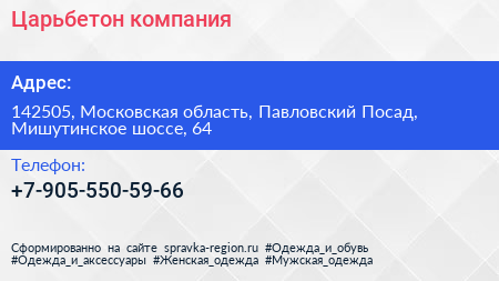 Царьбетон, компания по адресу 142505, Московская область, Павловский Посад, Мишутинское шоссе, 64 в дальнейшем Организация, размещена в следующих категориях: