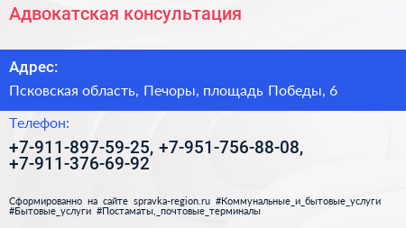 Адвокатская консультация по адресу Псковская область, Печоры, площадь Победы, 6 в дальнейшем Организация, размещена в следующих категориях: