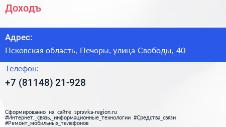 Доходъ по адресу Псковская область, Печоры, улица Свободы, 40 в дальнейшем Организация, размещена в следующих категориях: