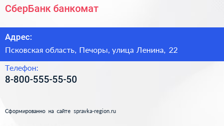 СберБанк, банкомат по адресу Псковская область, Печоры, улица Ленина, 22 в дальнейшем Организация, размещена в следующих категориях: